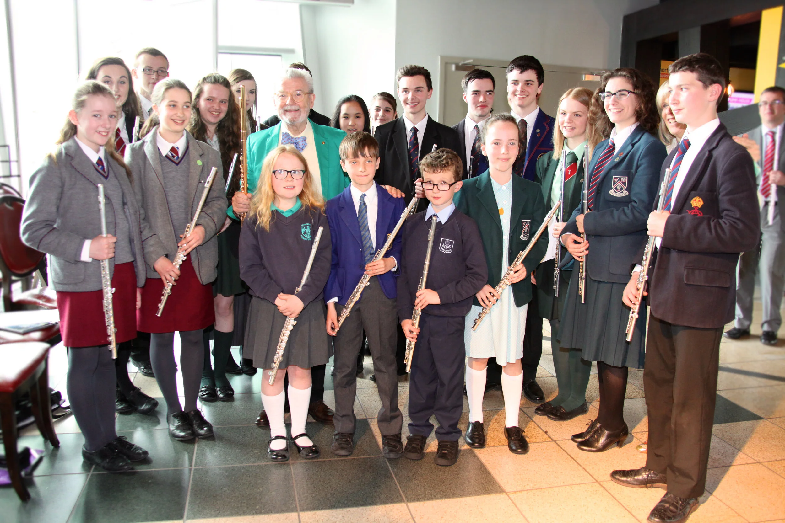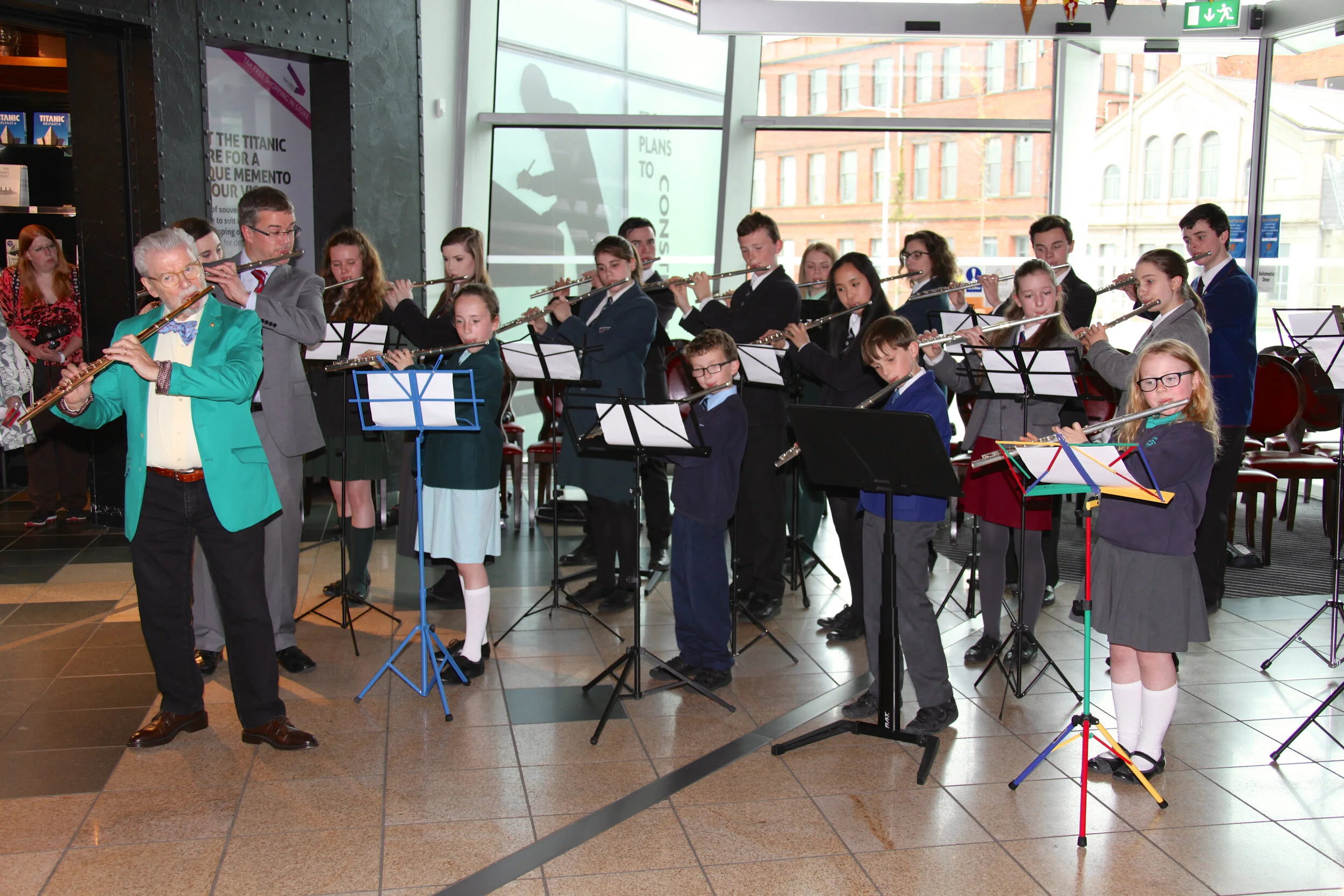 Sir James Galway with Katie and Isabel at Titanic Belfast