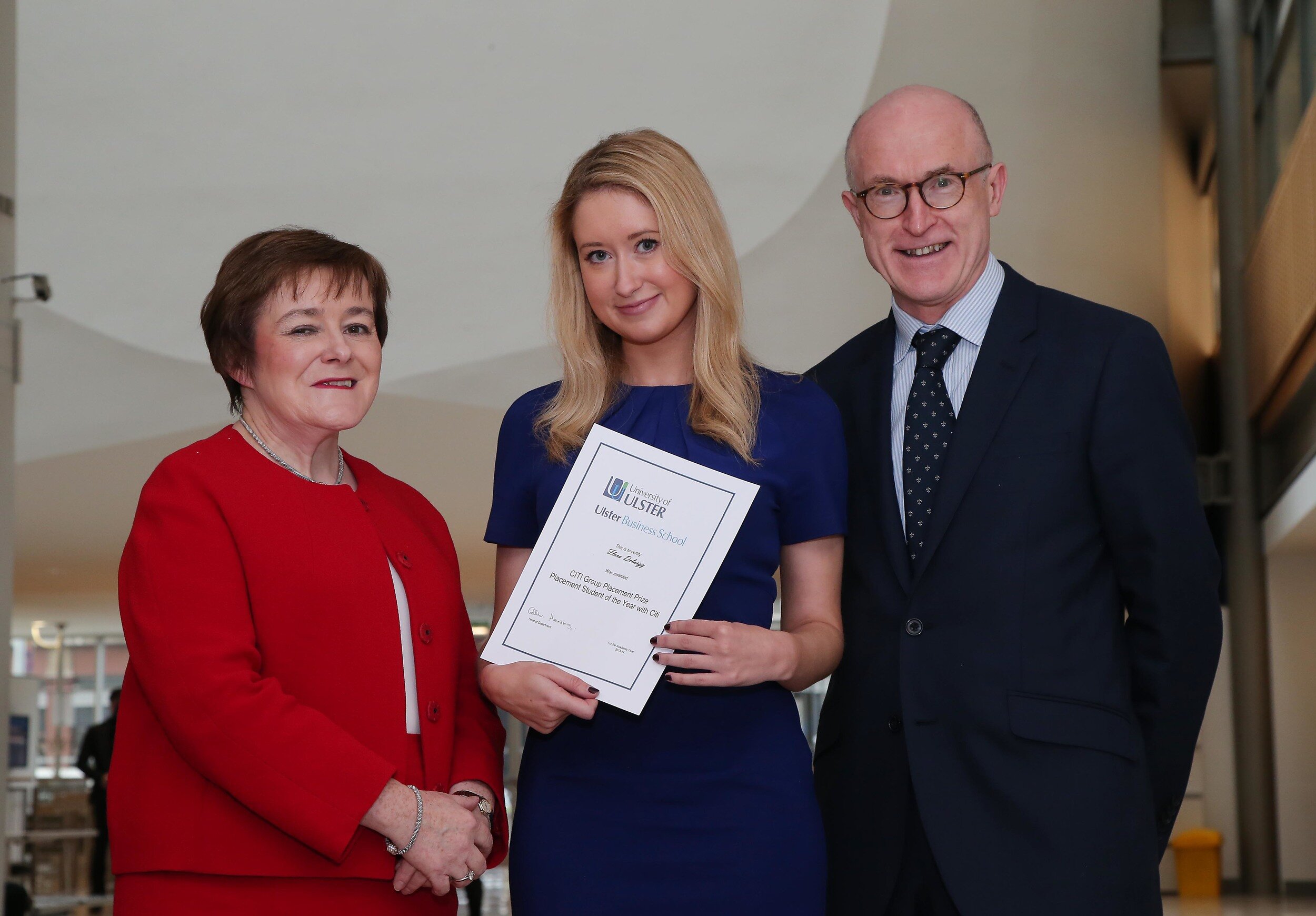 Flora Delargy, a former pupil of Victoria College Belfast has won the Citi Group Award for being the Highest Performing Student on Placement as part of her MSC in Financial Services at the Ulster University Business School. It was a proud moment for Flora’s father, UTV’s Business Correspondent Jamie Delargy, as he had completed the same course at the School ten years previously. The Award was presented at the annual Ulster University Business School’s Student Awards event organised by the Department of Accounting, Finance and Economics. Also pictured is Professor Marie McHugh, Dean of the Ulster University Business School.